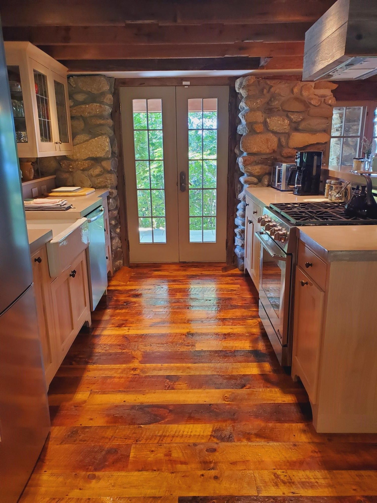 Natural and reclaimed materials were used in the three-and-a-half-year renovation whenever possible and are especially noteworthy in the hand-hewn beams recovered from a barn, and in the cladding of the skipjack pine kitchen. It's no wonder the home was featured in an editorial in a local home design magazine.